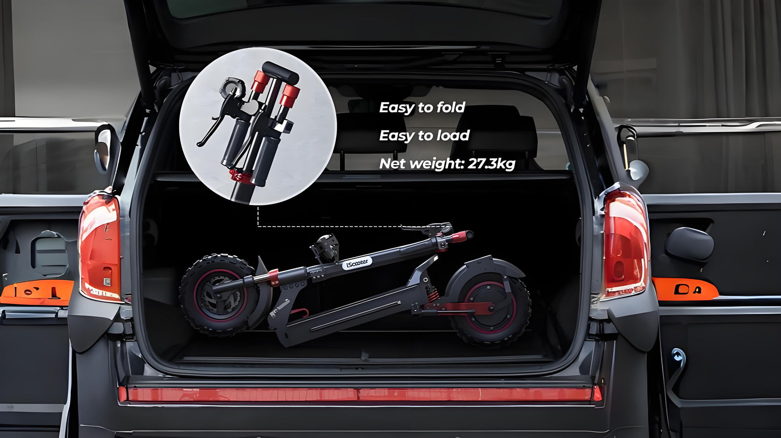 The iScooter iX5S is powered by a rugged 1000W brushless rear hub motor that delivers impressive acceleration and a top speed of up to 45km/h. This motor has a peak power of 1800W, enabling the scooter to easily tackle slopes of up to 25 degrees, making it suitable for both urban commuting and off-road adventures. As a result, the iScooter iX5S supports a maximum rider weight of 150kg.