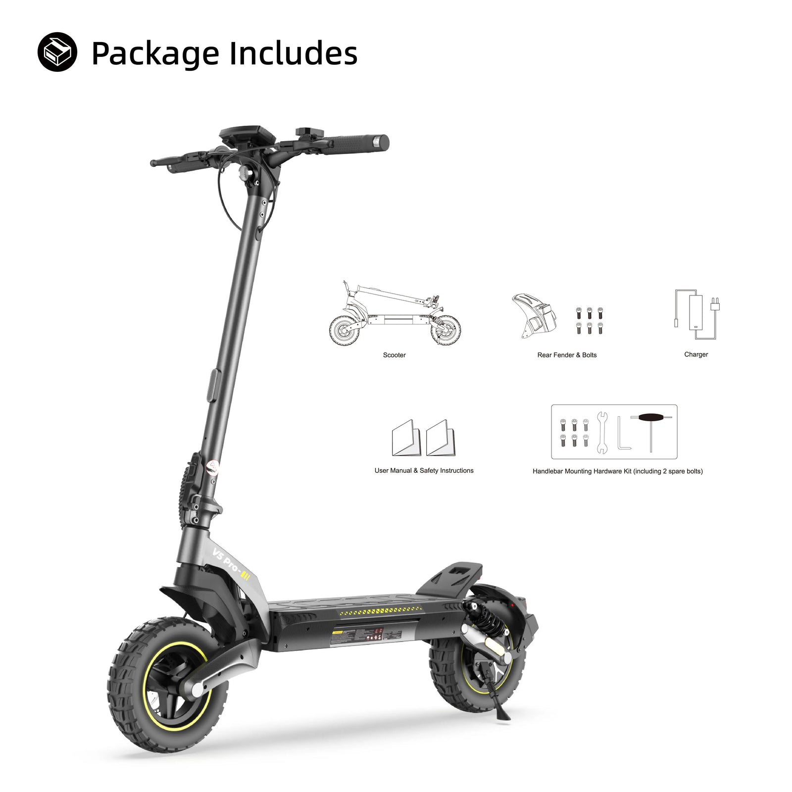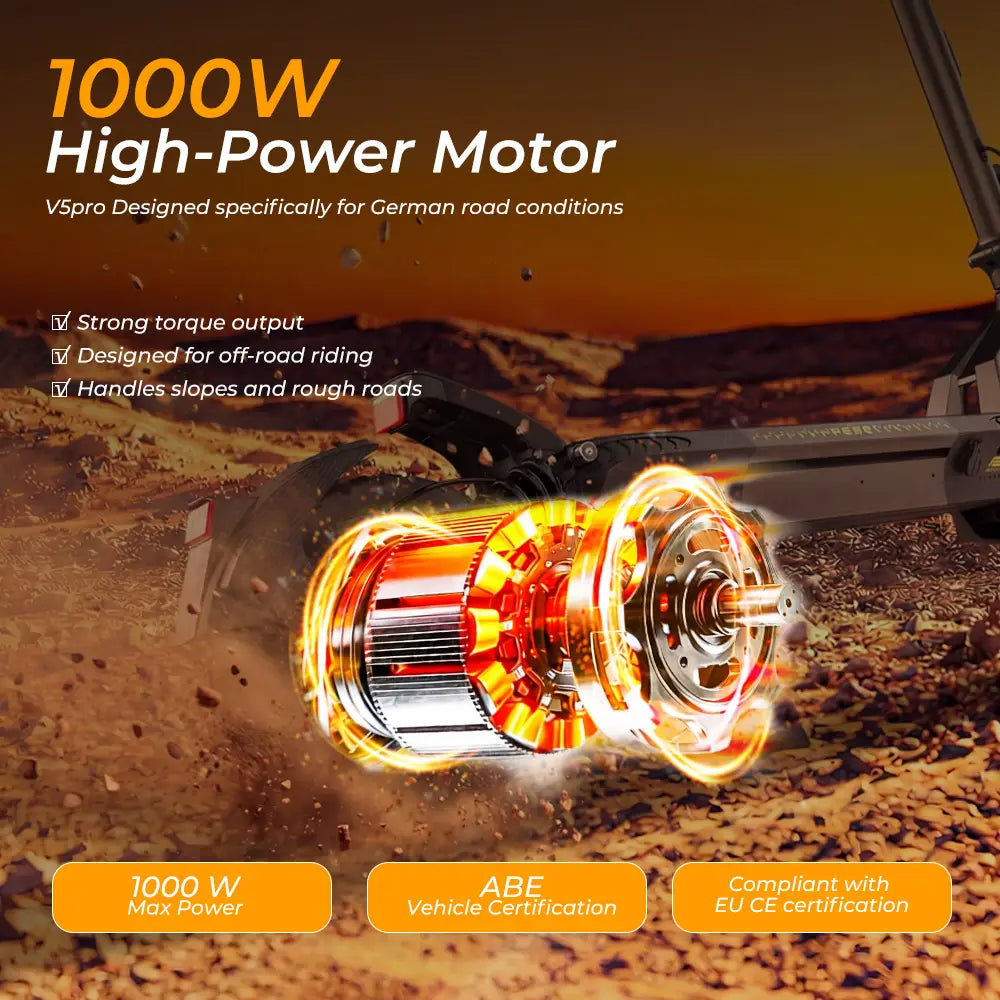 The V5pro features a 500W rated (1000W max) motor, 20 km/h top speed, designed for German roads with strong torque for off-road, slopes, and rough roads, plus ABE and EU CE certification.