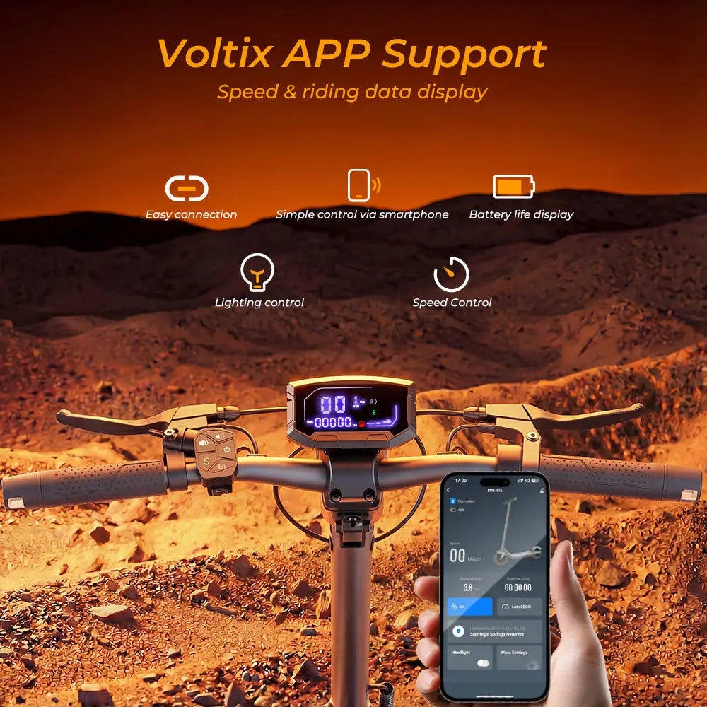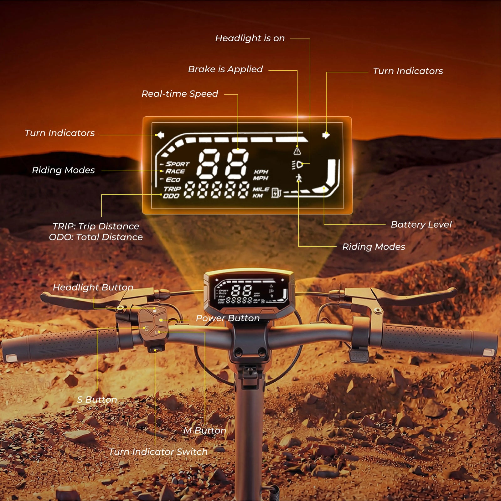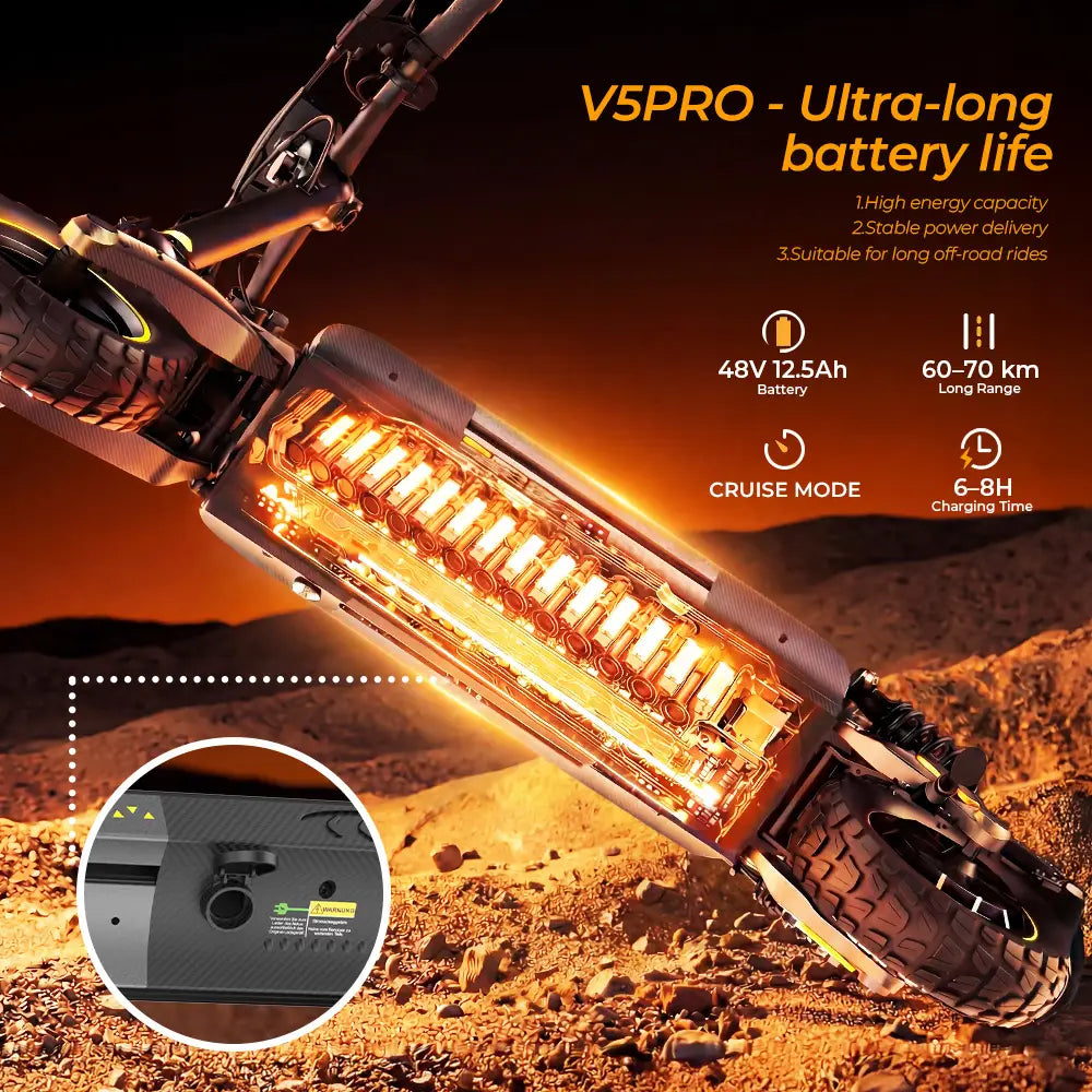 The V5PRO delivers ultra-long battery life with high energy capacity, stable power delivery, and suitability for long off-road rides, featuring a 48V 12.5Ah battery that provides a 60–70 km range, cruise mode, and a 6–8 hour charging time.