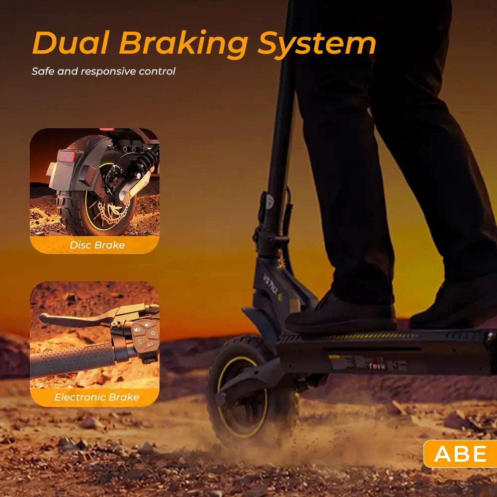 The dual braking system provides safe and responsive control, featuring both a disc brake and an electronic brake.