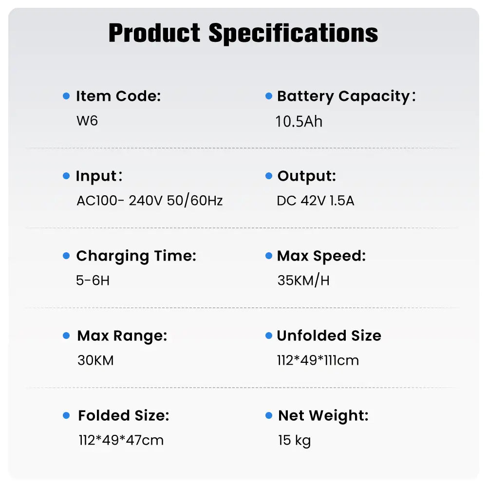 The iScooter W6 features a 36V 7.8Ah battery with a maximum range of up to 25-30KM. It includes a BMS (Battery Management System) with 6-layer safety protection, enabling real-time monitoring of battery safety. The charging time is 5-6 hours.