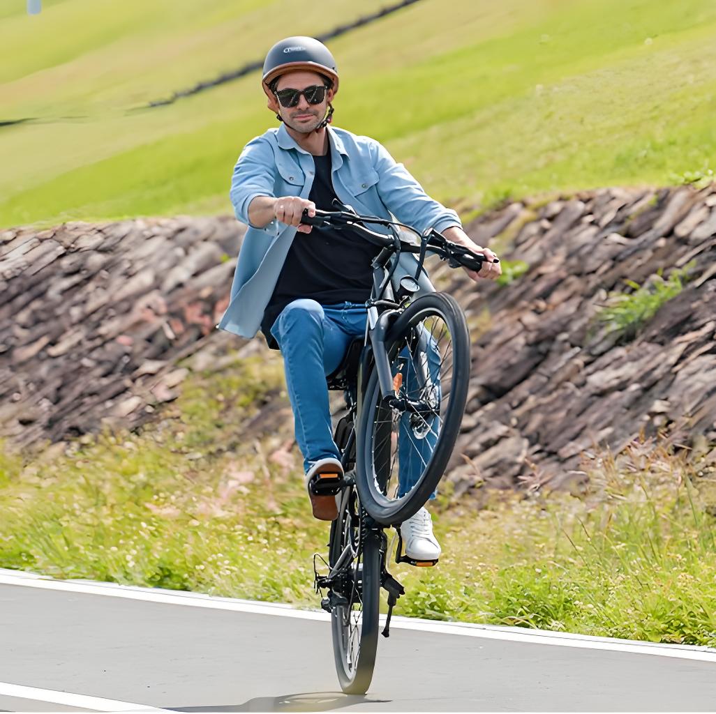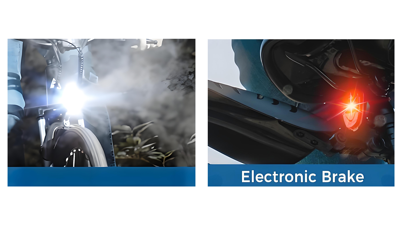 The iScooter EB3 electric bicycle is equipped with electronic dual-disc brakes, which significantly reduce braking distance during rides. This feature ensures safer and more responsive stopping power, enhancing overall riding safety and control.