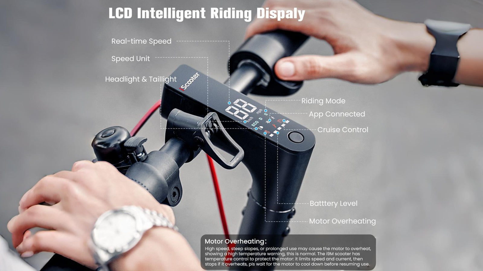 The i9M features an intelligent LCD display that provides real-time information about speed, battery life, and other key settings. It shows the current mode and light settings, making it easy to adjust as needed. The display has a clear, easy-to-read interface.