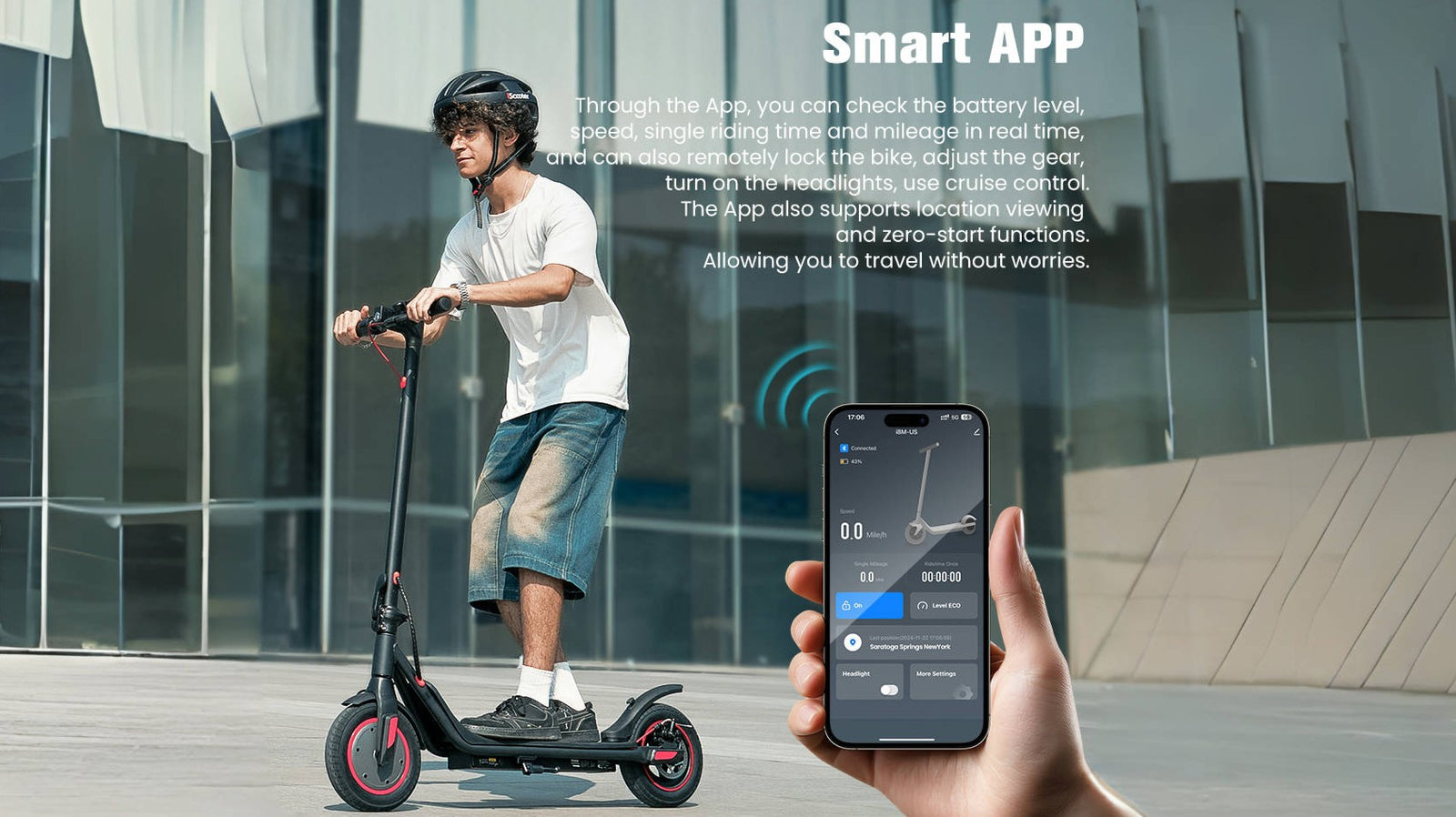 Through the App, you can check the battery level,speed, single riding time and mileage in real time,and can also remotely lock the bike, adjust the gear,turn on the headlights, use cruise control.The App also supports location viewingand zero-start functionsAllowing you to travel without worries.