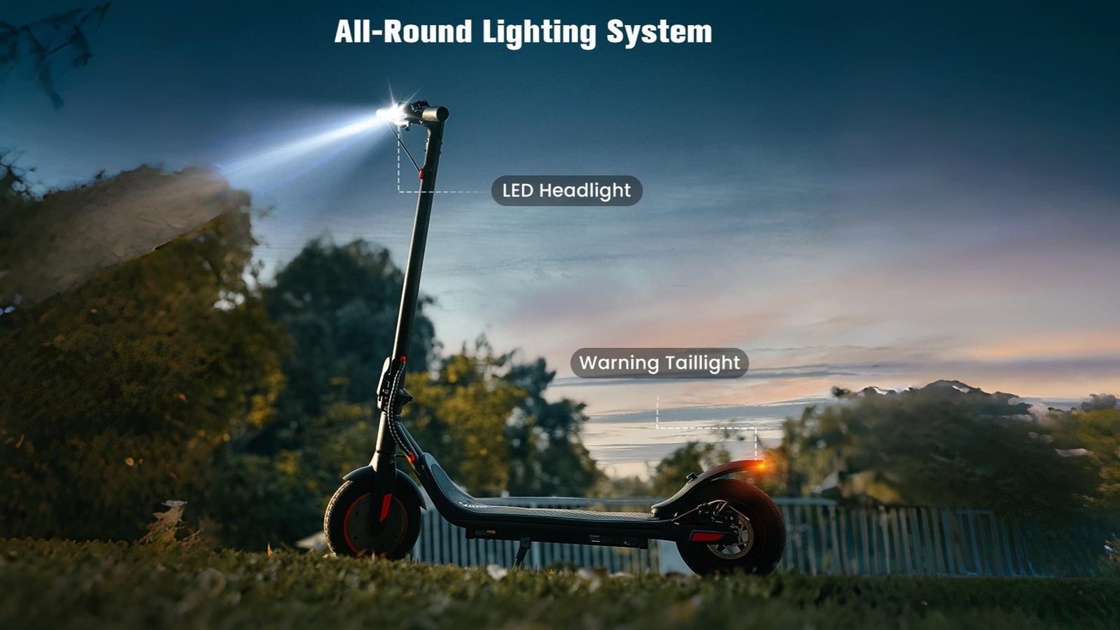 This electric scooter stands out with its all-round lighting system. The energy-efficient LED headlights illuminate the path ahead clearly, ensuring safety during rides. Complementing them are the highly visible warning tail lights, which alert following traffic.