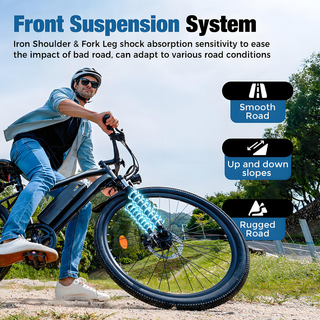 The iScooter EB3 electric bicycle is equipped with an Iron Shoulder & Fork Leg shock absorption system, which effectively eases the impact of bad road conditions. This feature allows the bike to adapt to various road surfaces, ensuring a smooth and comfortable ride even on rough terrain.