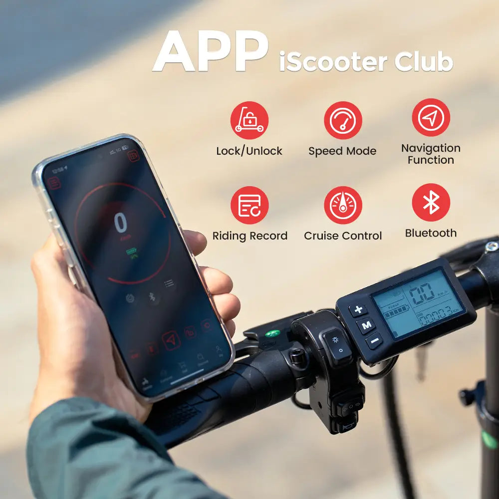 The iScooter F7 connects via Bluetooth to the "iscooter" APP, which provides functions including lock/unlock, speed mode selection, riding record tracking, cruise control, and navigation.