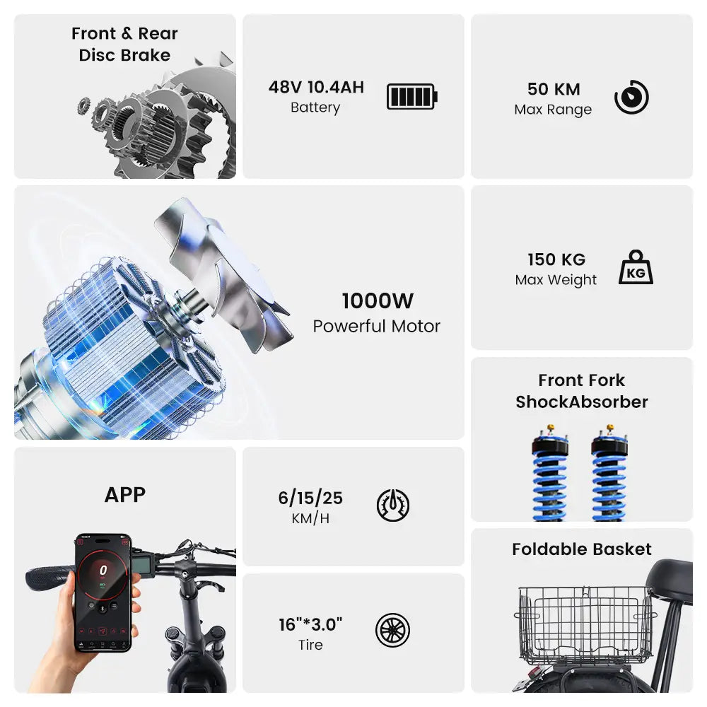 The iScooter F7 ensures a more comfortable driving experience, equipped with a front fork spring shock absorber and wide 16"*3.0" snow tires for enhanced stability and smooth rides.