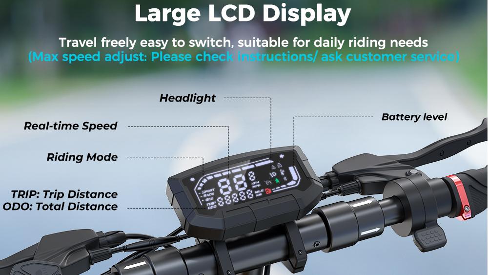• The iScooter iX3 features a multi-function LED screen that provides important information at a glance. Riders can easily monitor speed, battery life, distance traveled and selected riding mode, all displayed in high resolution for clear and easy-to-understand viewing. The intuitive layout allows for quick adjustments, enhancing the overall riding experience by providing instant access to key data. Large LCD Display
