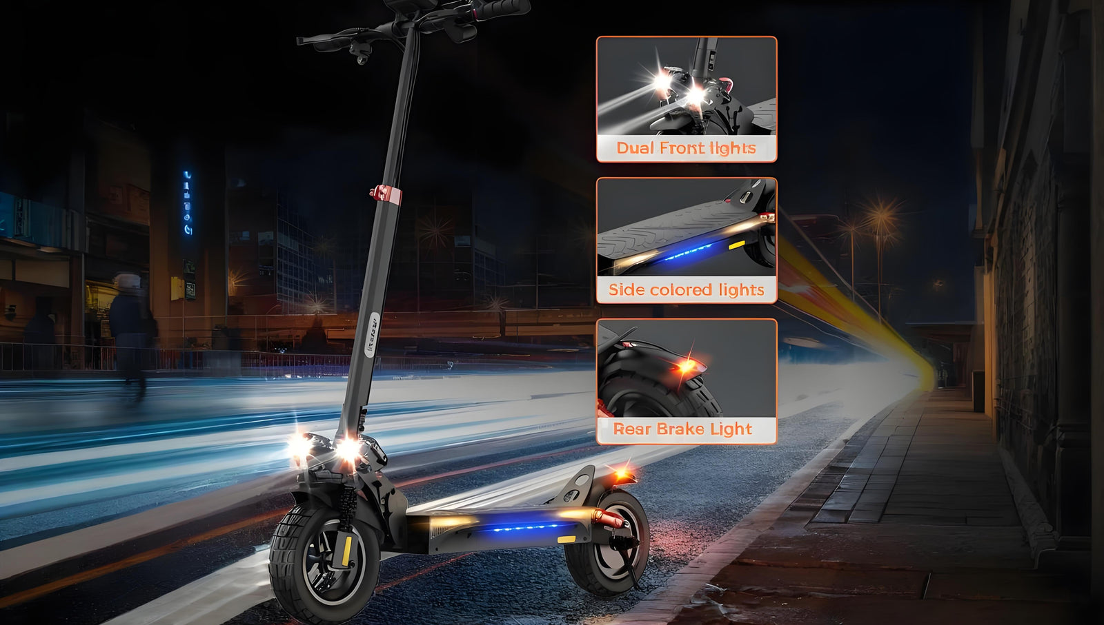 The iScooteriX4 scooter is equipped with two ultra-bright LED lights on the head to ensure safe riding at night. The integrated turn signals on the scooter enhance safety by providing a clear visual indication of the rider's intentions. The colored ambient lighting is both beautiful and practical, improving visibility when riding at night while allowing the rider to express their style.