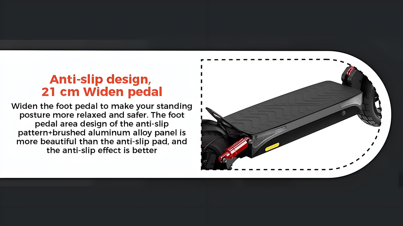 Anti-slip design,21 cm Widen pedal。Widen the foot pedal to make your standingposture more relaxed and safer. The footpedal area design of the anti-slippattern+brushed aluminum alloy panel ismore beautiful than the anti-slip pad, andthe anti-slip effect is better