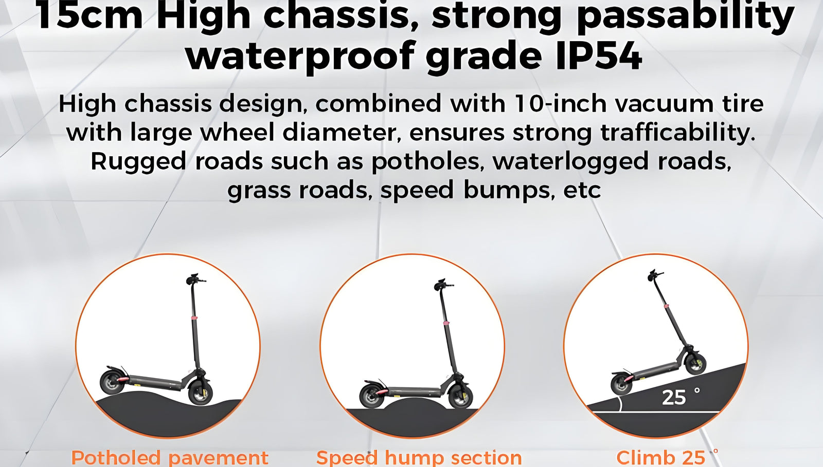 Strong passability Waterproof level IP54. High chassis design, combined with large wheel diameter 10-inch vacuum tires, ensures strong passability. Rough roads such as potholes, waterlogged, grass, speed bumps, etc.