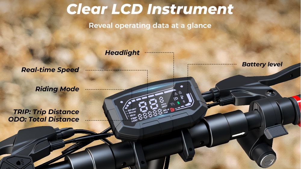 The iScooter iX4 features a multi-functionLED screen that provides importantinformation at a glance. Riders can easilymonitor speed, battery life, distancetraveled and selected riding mode, alldisplayed in high resolution for clear andeasy-to-understand viewing.The intuitivelayout allows for quick adjustments,enhancing the overall riding experienceby providing instant access to key data.Large LcD Display