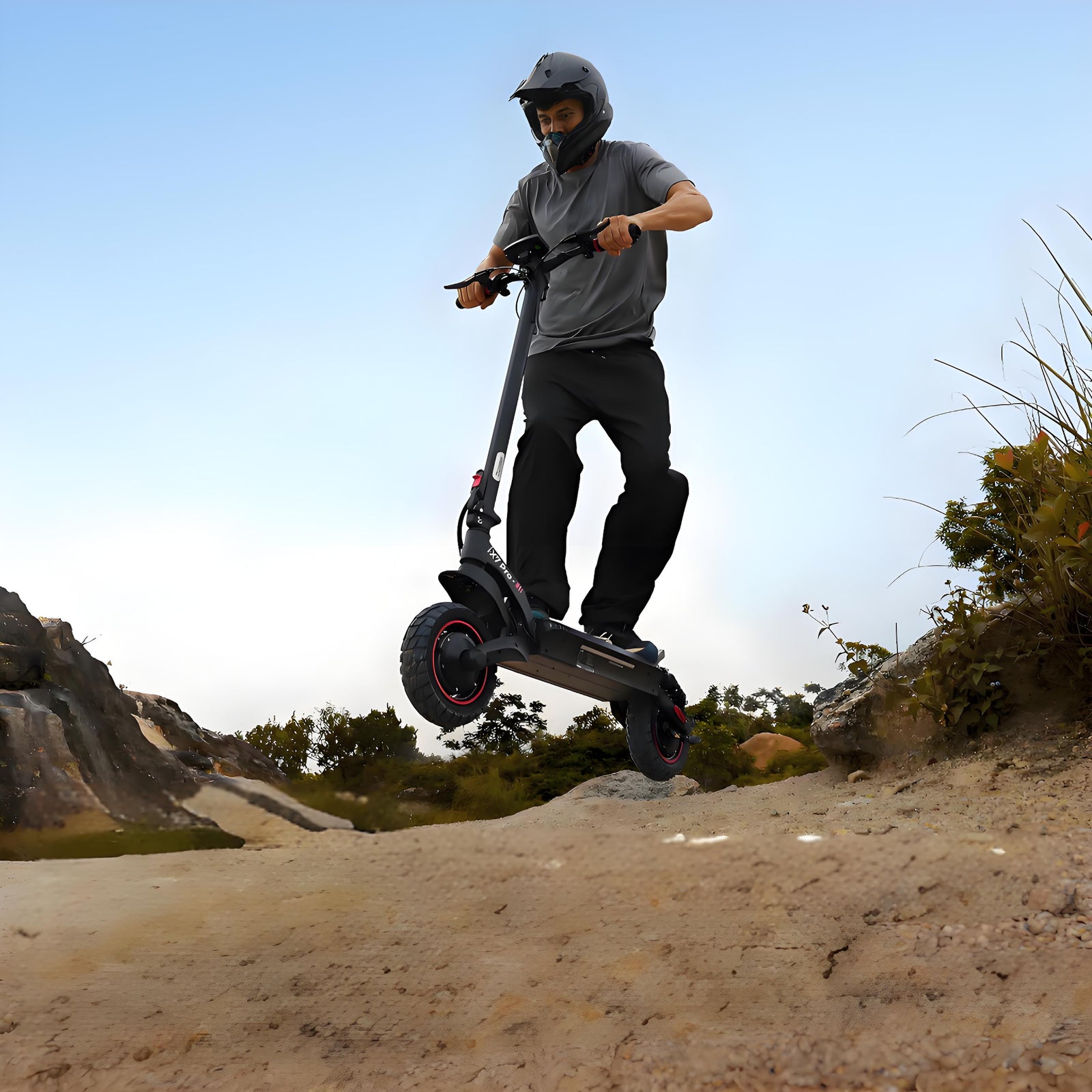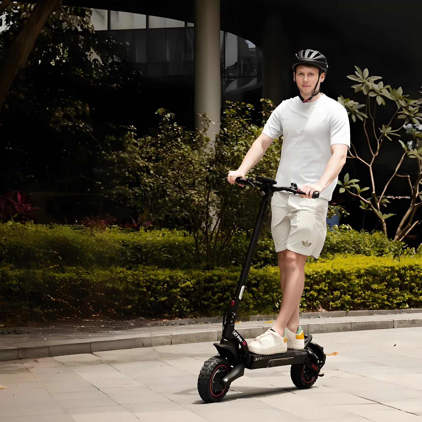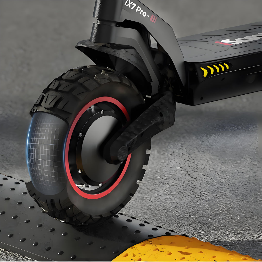 The iScooter iX7 Pro is equipped with 10” off-road pneumatic tubeless tires that perform well on a variety of terrains including city streets, dirt roads, sand and gravel. These tires not only absorb the impact of uneven roads and improve riding comfort, but also reduce the risk of punctures and air leaks compared to traditional inner tubes.