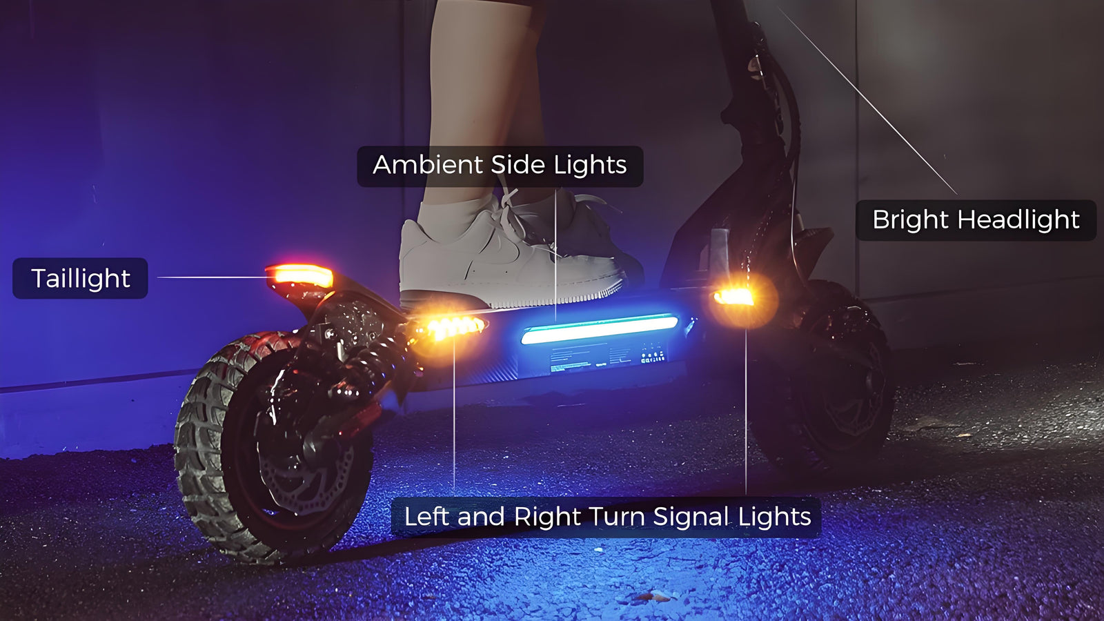 The iScooter iX7 Pro is equipped with an extra-bright headlight to ensure optimal visibility when riding at night. Integrated turn indicators signal to other road users which direction you are going. It is also equipped with ambient lighting to improve visibility at night.