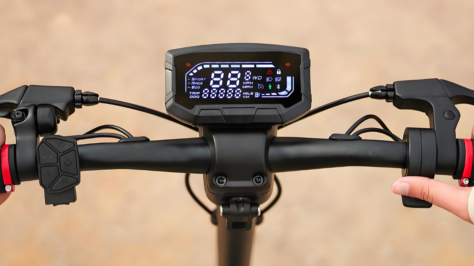 The iScooter iX7 Pro features an ergonomic digital screen for full control of your ride. This smart display allows you to monitor speed, switch between modes, check battery status, and manage features like indicators, lights, and zero-start.