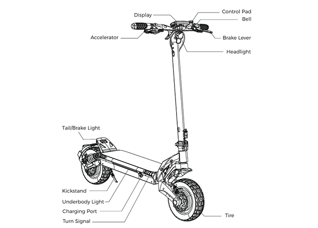 Tire10″ Off-Road TiresLightsLED IntegratedBrakesDual Braking SystemsuspensionFront and rear double shock absorbers